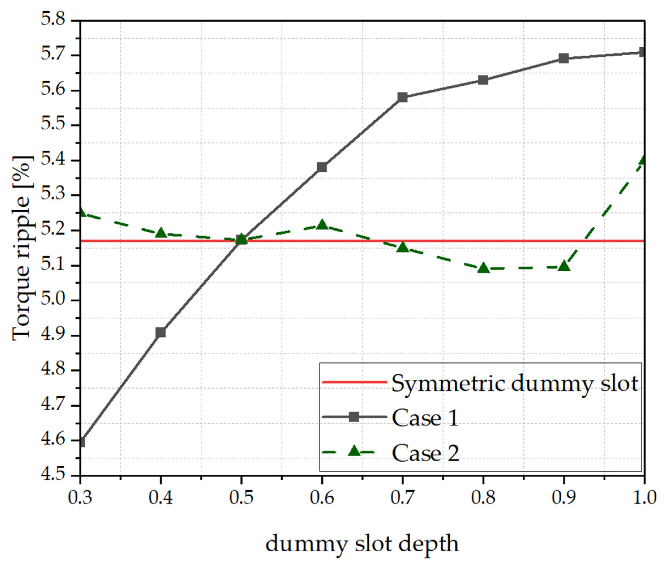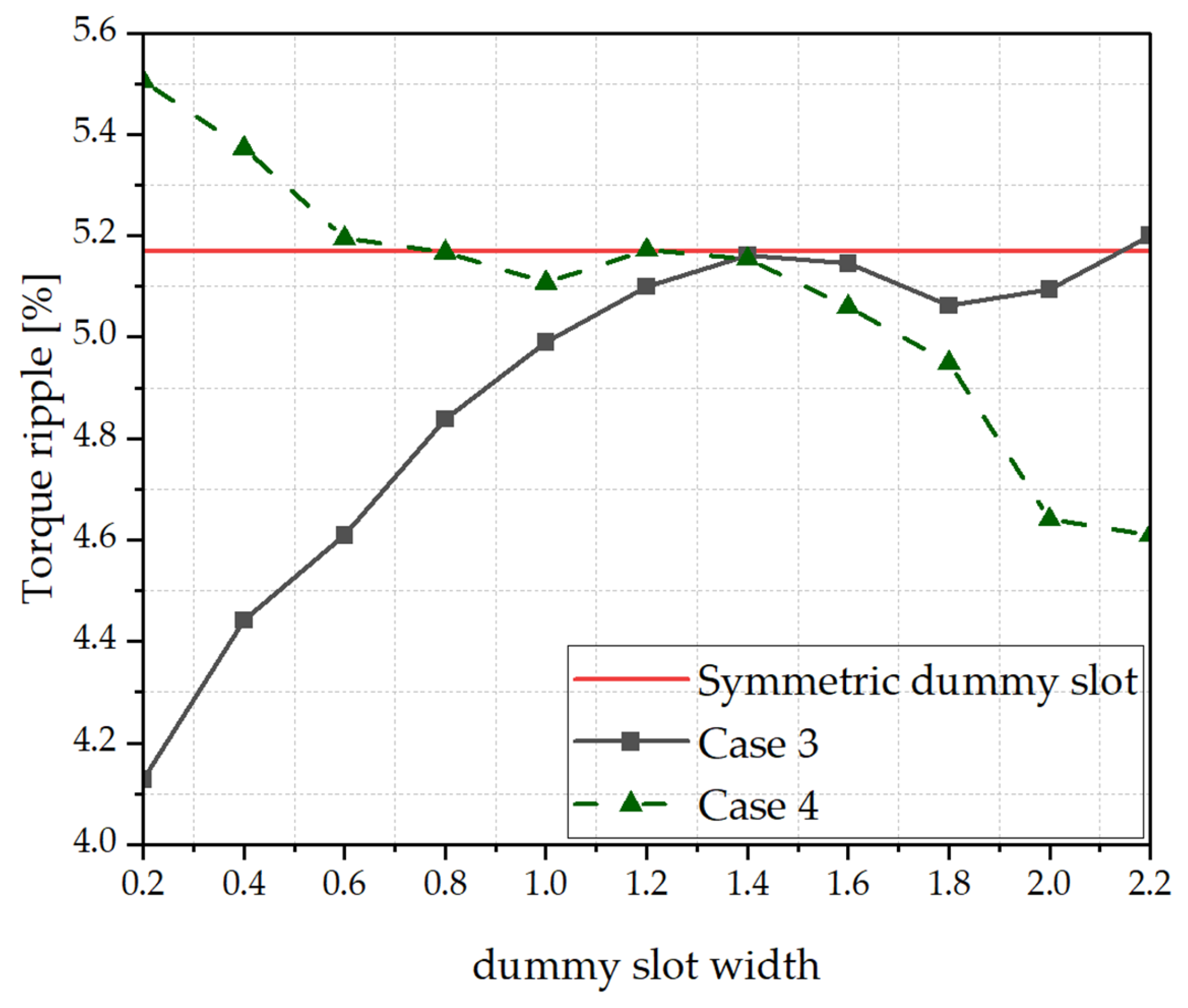 - A stator structure with two asymmetric dummy slots per stator slot (differing in width and depth) was proposed. This design demonstrated more effective torque ripple reduction compared with the conventional symmetric dummy slot configuration.