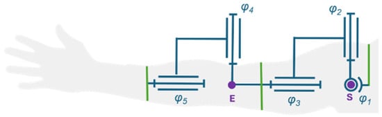 Kinematic chain of the exoskeleton in a default position (φi refers to the i-th DOF joint variable of the kinematic chain, purple dots represent modelled joint centre points (E for elbow and S for shoulder), green lines represent attachment of the exoskeleton to the user).