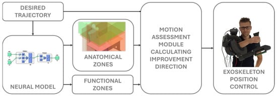 The control system of the exoskeleton is intended to enable the complex assessment of any exercise based only on its trajectory. Initially, the registered motion will be automatically divided into expected subsegments. Then, a neural model will assess each of them regarding similarities to the modelled ADLs. Based on these, the potential anatomical compensations and functional errors will be defined within the potential configuration hyperplanes. With these, the assessment module will be capable of analysing the correctness of motion and computing the required support of the drives, which will be executed directly with the low-level controllers. The block diagram of the control algorithm is presented in Figure 2.