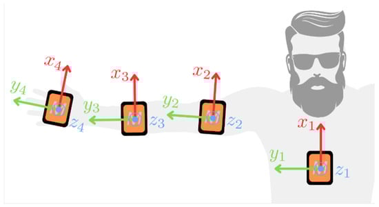 In this research, four IMUs placed on the subject’s body, as shown in Figure 3, were used to measure the motion of the upper extremity. These were selected as an alternative to traditional vision-based motion capture systems, which are often prohibitively expensive and require complex setups [28,29] with acceptable accuracy and reliability [30]. A Movella DOT system, recording with 120 Hz frequency, was used for the measurements. Each sensor is equipped with a 3-axis gyroscope, a 3-axis accelerometer, and a 3-axis magnetometer [31]. The software provided by Movella was used to register orientations of single sensors as ZYX Euler angle triples.