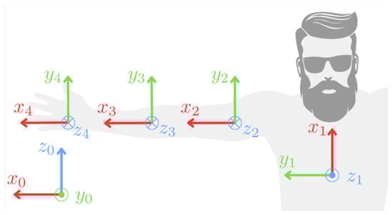 The assumed default orientations of the frames of reference correlated with the body segments are illustrated in Figure 4. For the trunk, the default orientation coincides with the global frame. The X-axis is aligned with the respective segment’s long axis for the arm and forearm frames. In contrast, the Y-axis is oriented in the opposite direction to the gravitational force in the default configuration. The frame corresponding to the palm shares the same default orientation as the forearm frame. This specific arrangement of the frames simplifies the subsequent task of determining the joint rotations. It is important to note that, at this stage, the carrying angle of the elbow is assumed to be 0.
