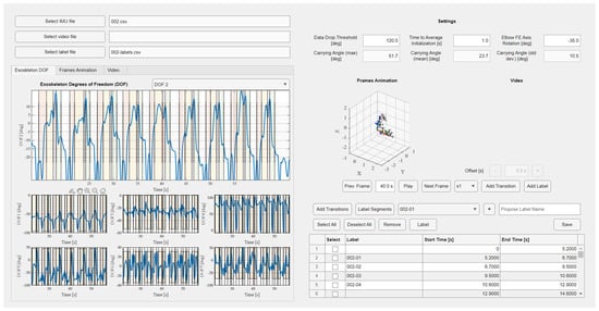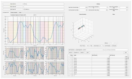 Graphical user interface of the developed software for processing the registered trajectories (motion trajectories divided into recomputed seven DOFs on the left side with an option to add motion subsegments, stick model and the video optional preview on the top right side, and the segments labelling window on the bottom right side).
