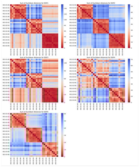 Sum of Euclidean distances for motion 001 (repetition of the same tasks compared in rows and columns; enumeration is built in the form of task–segment–repetition; each graph represents other DOF of the model).