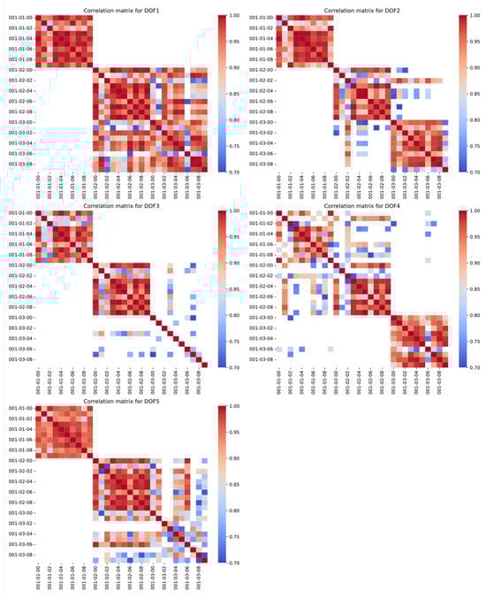 Correlation matrices for motion 001 (repetition of the same tasks compared in rows and columns; enumeration is built in the form of task–segment–repetition; each graph represents other DOF of the model).
