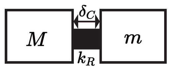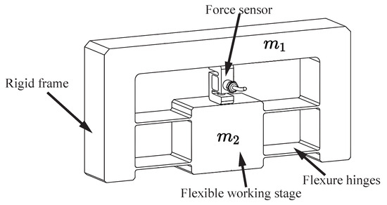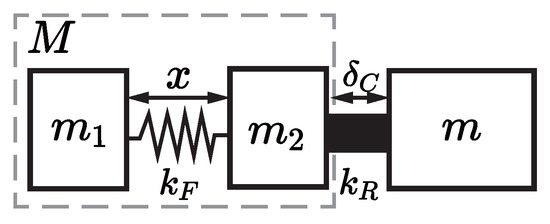 Utilizing the novel rigid–flexible coupled contact model illustrated in Figure 2, we develop the dynamic model of a rigid–flexible coupled constant-force control mechanism as shown in Figure 3. The proposed mechanism for rigid–flexible coupled constant-force control, as depicted in Figure 3, consists of two interconnected masses, denoted as and . A flexible element characterized by stiffness and damping connects masses and . Simultaneously, the contact object m is rigidly attached to via interface parameters (stiffness) and (damping). It is important to highlight that the relationship between stiffness parameters is characterized by , which guarantees that the contact interface exhibits predominant rigidity while allowing for flexibility in the coupling between masses.