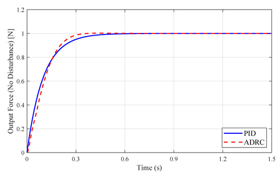 Comparative step responses of PID- and ADRC-based constant-force control systems under disturbance-free conditions.