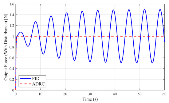 The step responses of the PID and ADRC controllers, as depicted in Figure 6, exhibit a remarkable similarity under disturbance-free conditions, with both systems achieving stabilization within . The PID force attains a value of at , whereas the ADRC method achieves . This indicates a comparable degree of steady-state precision, with a variance of less than . The observed similarity can be ascribed to the linear feedback structure intrinsic to PID controller, in conjunction with the essential control capability of ADRC controller in the absence of external disturbances. However, as demonstrated in Figure 7, a significant difference is apparent in the presence of periodic disturbances. The PID controller exhibits pronounced oscillatory behavior, with the output force attaining a peak of at . Conversely, the ADRC controller proficiently constrains deviations to , attaining stabilization within post-disturbance. The observed resilience can be attributed to the LESO employed in ADRC, which proficiently estimates and alleviates the impact of disruptions via real-time state compensation.