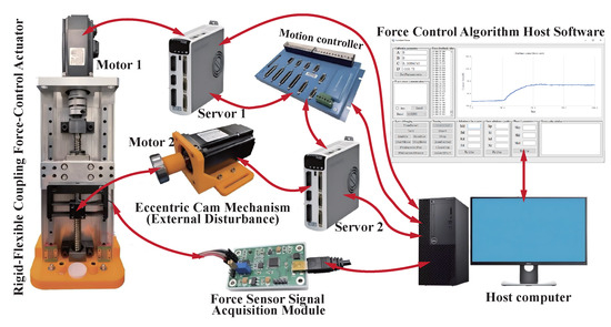 To verify the comparative conclusions made from the simulation studies in Section 3, an extensive experimental platform was established based on the dynamic model of the rigid–flexible coupled force control actuator depicted in Figure 3. This section offers a comprehensive overview of the mechanical architecture, hardware integration, and experimental technique.