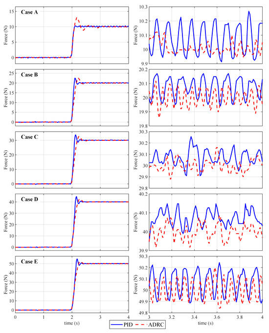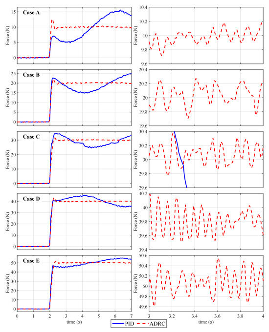 The test conditions align with the simulation scenarios in Section 3, enabling direct comparison between simulated and experimental results. The force sensor’s sampling rate is set to , and position feedback is synchronized for comprehensive data analysis. Both PID and ADRC parameters were initialized via [37], experimentally refined on Case A, and held constant for Cases B–E to objectively evaluate robustness against unknown disturbances.