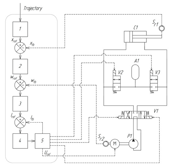 Structural diagram of an electrohydraulic actuator: (1) reference trajectory generator; (2) position regulator; (3) angular speed regulator; (4) current controller; (5) power electronics and valve control unit; (P1) hydraulic pump; (M) DC electric motor; (V1) 3-position 4-way directional valve; (V2 and V3) 2-position 2-way directional valves; (C1) hydraulic cylinder; (Sr1) displacement sensor; (Sr2) rotation sensor; (A1) hydraulic accumulator.