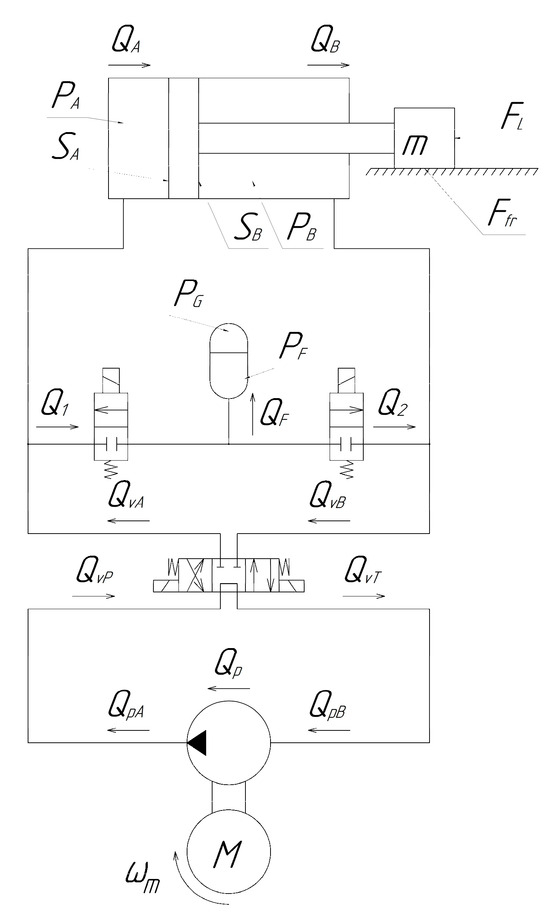 - PA, PB—pressures in the piston and rod chambers of the hydraulic cylinder [Pa].