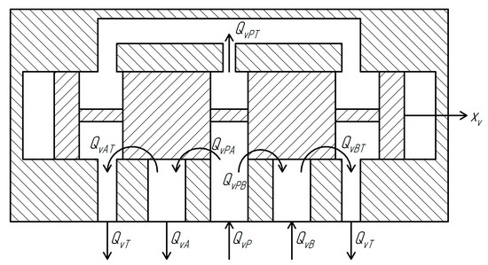 In order to draw up equations of hydraulic fluid flow rates in the hydraulic directional control valve, a calculation scheme of the hydraulic distributor was drawn up, as shown in Figure 3.