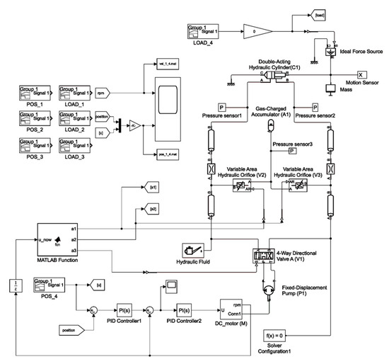 The EHA control system contains equipment related to controlling the position of the hydraulic cylinder. The controller is implemented as a discrete PID controller using a set of blocks of the MATLAB/Simulink PID library (Figure 4). The resulting mathematical model of the EHA was solved using MATLAB/Simulink (version R2021A) physical system modeling tools.