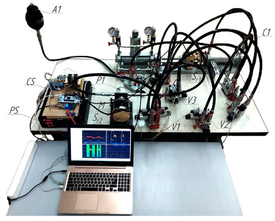 The main elements of the stand are hydraulic pump (P1); DC electric motor (M); control system (CS); power supply unit (PS); 3-position 4-way directional valve (V1); 2-position 2-way directional valves (V2, V3); hydraulic cylinder (C1); displacement sensor (incremental optical encoder) (Sr1); rotation sensor (absolute magnetic encoder) (Sr2); and hydraulic accumulator (A1). The control system operates the electric motor and the two-position directional control valves, whose switching enables the connection of the piston and rod chambers to the accumulator. An optical sensor mounted on the hydraulic cylinder rod is used as a displacement sensor. The sensor provides measurements with an accuracy of 0.025 mm. The driver is connected to the computer via the RS-485 interface using the ModBus RTU protocol, which is used to set the motion trajectory and transmit data such as rod displacement, electric motor rotational speed, and other parameters. Additionally, communication can also be established via the Ethernet interface for higher-speed data exchange and system integration.