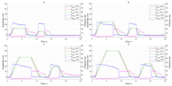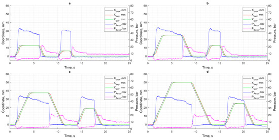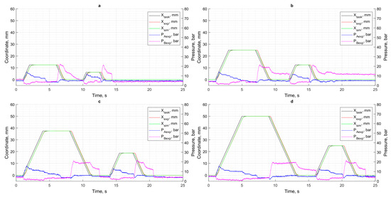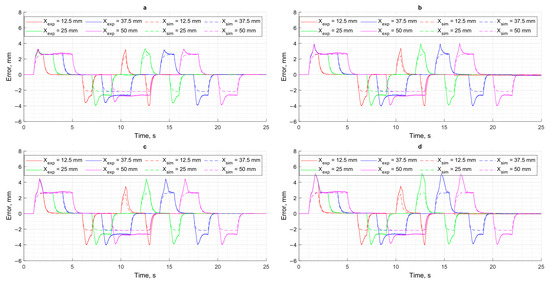 Results of motion control in the absence of load: (a) XCPC = 12.5 mm; (b) XCPC = 25 mm; (c) XCPC = 37.5 mm; (d) XCPC = 50 mm.