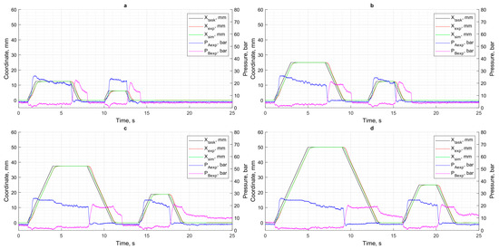 Figure 11 shows the difference in displacement trajectories between the simulation model and the physical prototype under various loads and different set coordinates of the positioning cycle (XCPC). Based on the data presented in Figure 10 and Figure 11, it can be noted that the positioning error and minor discrepancies between the simulation results and the experimental setup are primarily caused by actuation delays in the hydraulic components, as confirmed by other studies [12,31,32].