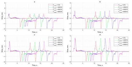 Control error: (a) FLoad = 0 N; (b) FLoad = 4000 N; (c) FLoad = 6000 N; (d) FLoad = 8000 N.