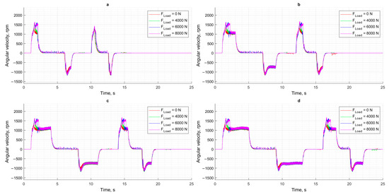 Angular velocity of DC motor: (a) XCPC = 12.5 mm; (b) XCPC = 25 mm; (c) XCPC = 37.5 mm; (d) XCPC = 50 mm.