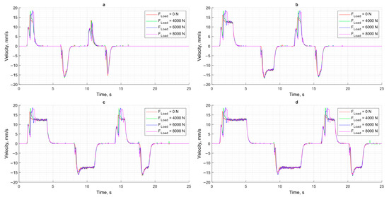 The speed of movement of the cylinder rod at different loads: (a) XCPC = 12.5 mm; (b) XCPC = 25 mm; (c) XCPC = 37.5 mm; (d) XCPC = 50 mm.