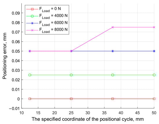 The dependence of the static positioning error on the set coordinate of the positional cycle under various loads.