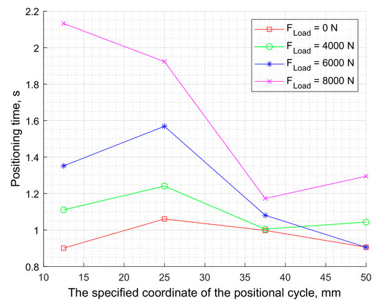 The analysis of the influence of external load showed that with its increase, there was a natural growth of both positioning time and positioning error. Thus, at a load of 8000 N, the static error in the steady-state mode was 0.075 mm, which is equivalent to about 0.15% of the maximum coordinate of the positioning cycle. The positioning time increased at the same time.