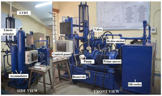 A Linear Variable Differential Transformer (LVDT) (9) is used to measure the position of the actuator. The linear actuators (11) and (13) are controlled by proportional flow control valves (10) and (12), respectively. Details of the components used in the experimental setup are listed in Table 1, and the system parameters are provided in Table 2. The hydraulic system used for experimentation is shown in Figure 2.