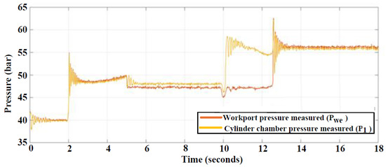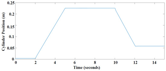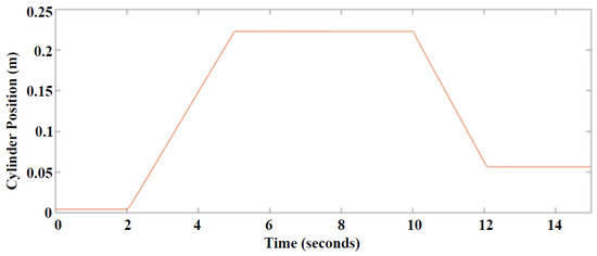 The pressure at the extension work port of the flow control valve is denoted by , and the pressure at the retraction work port is denoted by . Dynamic pressures at both work ports are measured by pressure sensors (8.1) and (8.2). The proportional flow control valve is a solenoid-actuated, closed-center, electrical position feedback type, connected to a computer running LabVIEW. A cRIO controller is used to transmit the control signals generated by the computer to the servo valve.