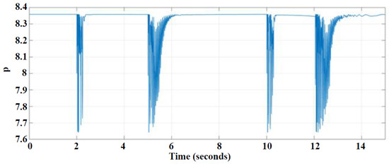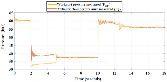 The extension work port pressure and piston side pressure for the command signal in Figure 3 are shown in Figure 4. The retraction work port pressure and rod side chamber pressure are illustrated in Figure 5.