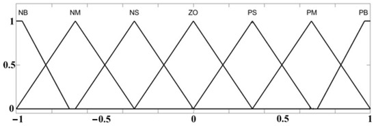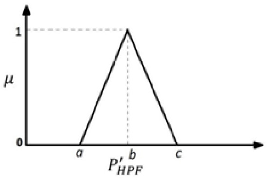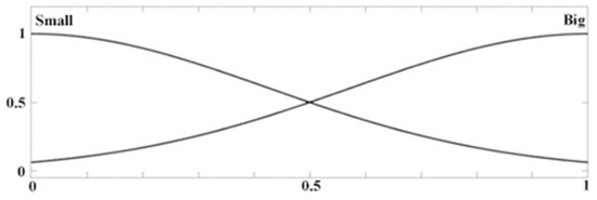 Let be the fuzzy set for and be the fuzzy set for . The membership functions of these fuzzy sets are shown in Figure 8. Triangular and logarithmic membership functions are used for the fuzzy input and output, respectively.