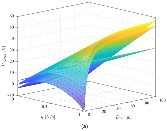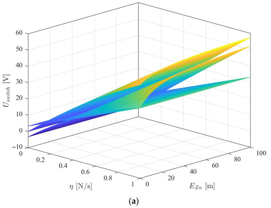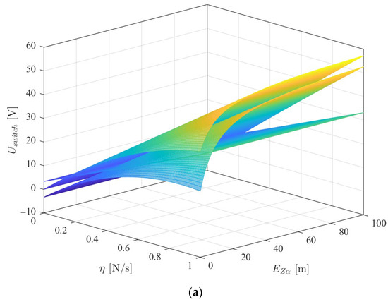 In Figure 8a, Figure 9a, and Figure 10a, the two curved surfaces on top represent the upper bounds for and the plane on the bottom represents the lower bound. As long as the lower bound for is lower than the upper bound, there exist multiple values of that guarantee the stability of the controller. An interesting result appears when the value of is very small: the upper-limit surfaces curve and intersect the lower-limit surface at low values of , as is particularly noticeable in Figure 8a. This indicates that very near the origin, with low values, the system may become locally unstable, leading to an increase in because conditions (95), (107), and (103) are not simultaneously satisfied. However, when this occurs, the value of of the next switching sequence will be higher, eventually leading to a bounded state, as described in Section 4.3. Figure 8b, Figure 9b, and Figure 10b represent 2D cross-sections of Figure 8a, Figure 9a, and Figure 10a, respectively. In Figure 8b, Figure 9b, and Figure 10b, the dash-dotted lines correspond to the upper bound for according to expression (95) for each of the selected values. The continuous lines represent the upper bounds according to expression (107), and the lower bound is represented by the dashed lines. The color of each line represents a particular value of . The horizontal magenta line corresponds to the physical limit of the battery voltage. In each of Figure 8b, Figure 9b, and Figure 10b, the regions below the upper bounds and above the lower bounds are possible solutions, as long as they are lower than the battery voltage. These regions are shaded in green for the particular case of = 1 m. As an example, let us consider Figure 9b. If , the lower limit is higher than the upper limits for each of the presented values of . This means that this value of is not an admissible solution. On the other hand, if , the lower bound is lower than both upper bounds for each of the presented values of and the controller is therefore stable. The values obtained in Figure 8, Figure 9 and Figure 10 show that the controller can be implemented since there are admissible values of below the battery voltage level. Also, it should be noted that the upper and lower bounds were obtained with very conservative estimations and that the real bounds would broaden the range of admissible values for . In this manner, the practical utility of the controller is shown.