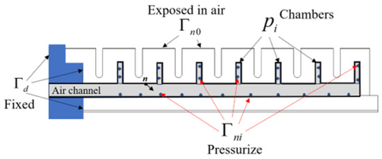 To establish a generic method for soft robot modeling and prove it, we start with the fundamental physics of soft bodies. The intrinsic dynamics of a soft robot can be represented by its governing equation in three-dimensional space (i.e., Navier-Cauchy equation) with boundary conditions (BCs), and initial conditions (ICs), considering high deformation scenarios. For pneumatic soft robots, air pressure is applied through multiple inside chambers for actuation as shown in Figure 1. Such actuation will impact the ICs and BCs, and the governing equation for soft bodies remain unchanged once the robot design is completed because the domain physics is only applied to the soft body. The governing equation of soft matter deformation using Navier-Cauchy’s equation is expressed by Equation (1), the IC is expressed by Equation (2), and Equations (3)–(5) are BCs for this case.