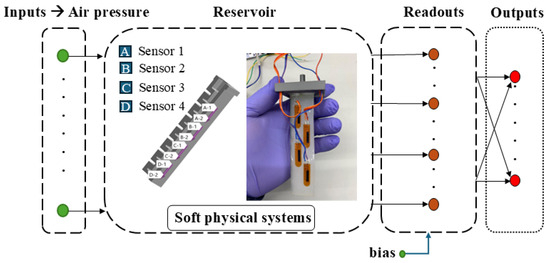 With the real-time sensing data that represent the nonlinearity of the soft finger, the tip trajectory prediction requires very low computation cost and only needs linear operation of these data. This aligns with the idea of embodied intelligence through reservoir computing. Reservoir computing architecture embodies a reservoir for mapping nonlinear inputs (temporal or sequential data processing) into a high dimensional space such that the readout can be analyzed by a simple learning algorithm (for example linear or polynomial regression) to provide a desired output [16,22]. In this context, the soft robot’s deformable body can be seen as the reservoir, where its material properties and the way it responds to inputs can be harnessed for computation. With the first principles physics of nonlinearity of soft bodies explained in Section 2.1, such soft bodies and their mechanical properties can be exploited to simplify control and enable adaptive behaviors. The computation is only a linear combination of the physical information of the soft body represented by real-time sensing signals, as shown in Figure 2.