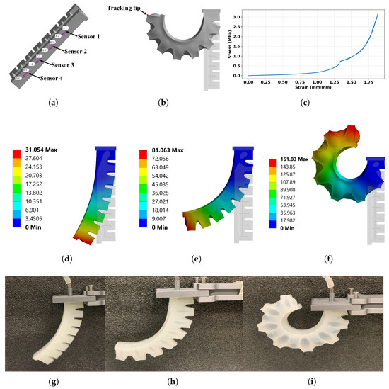 Numerical simulation and experimental setup and comparison: (a) sensor placement for deflection measurement; (b) tracked tip as the output; (c) stress-strain curve for loading and unloading at 19 kPa; (d–f) FEM simulation results under the pressure of 4 kPa, 10 kPa, and 19 kPa, respectively; (g–i) experimental recording under the pressure of 4 kPa, 10 kPa, and 19 kPa.