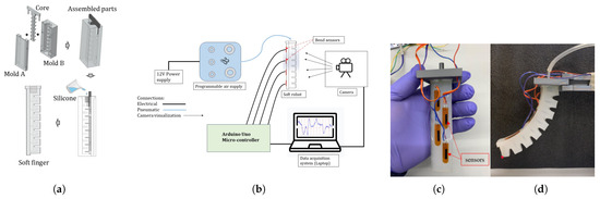 The soft finger design, Figure 4 with geometrical parameters shown in Table 1 was fabricated using molds and Ecoflex 00-50 (Smooth-On, Inc., Macungie, PA, USA). The design of the molds (2 pieces to create PneuNet) was accomplished by SolidWorks 2022 and 3D printing. To prevent any leakage, the mold was meticulously sealed, ensuring a watertight enclosure for the silicone mixture. The Ecoflex 00-50 comprises two components, part A and part B. A mixing ratio of 1-to-1 for parts A and B was accurately weighed before mixing to achieve a homogeneous blend. To eliminate any trapped air bubbles within the silicone mixture, the homogenized mixture was subjected to a degassing process through a vacuum chamber set at −25 mmHg for a duration of 3 to 5 min. This step was performed before and after pouring the mixture into the mold to ensure optimal results Figure 5a. The curing time for the soft-ridged robot fabrication ranged from 4 to 6 h, allowing sufficient time for the silicone to solidify and acquire the desired mechanical properties. To create the internal air channel, a pre-shaped core (3D-printed or silicone rod) was inserted into the mold cavity prior to casting. Ease Release 200 (Smooth-On Inc.) was applied to the core’s surface before pouring the silicone. After curing, the core was gently extracted by manually wiggling it from side to side, ensuring minimal disruption to the cured structure. This process resulted in a clean internal pneumatic channel as shown in Figure 5a. Four bend sensors (Flexpoint Sensor Systems, Inc., West Jordan, UT, USA) that represent the location were placed during the curing process. The final soft finger with sensors is shown in Figure 5c.