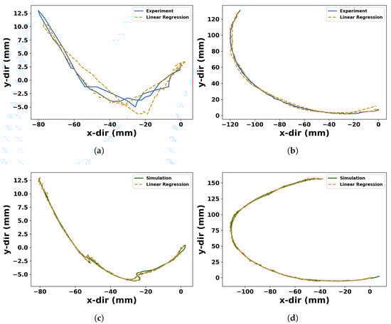 Comparison between simulation and experimental data of tip trajectory prediction against a linear regression model. (a,b) experimental results at 10 kPa, and 19 kPa, respectively. (c,d) simulation results at 10 kPa, and 19 kPa, respectively.