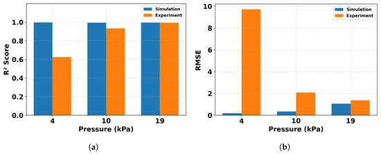 Quantitative comparison of tip trajectory metrics at varying pressures. (a) coefficient of determination (), (b) root mean square error (RMSE).