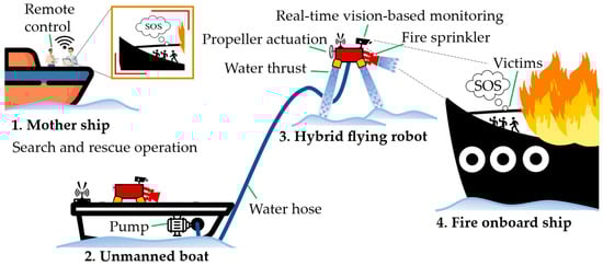 In recent years, innovations in embedded systems, lightweight materials, and AI have made it both feasible and efficient to design and deploy flying robots such as drones and unmanned aerial vehicles (UAVs). As a result, its market has increased from USD 2.38 billion in 2000 to USD 47.93 billion in 2024 [1,2]. In particular, the use of drones has significantly grown in maritime-related applications, such as ship inspections, search and rescue missions, and environmental monitoring [3,4,5]. The real-time information collected, such as ocean currents, water quality, and weather conditions, allows more precise and timely decision-making for maritime operations. Such data are crucial for enhancing navigational safety, optimizing maritime routes, and minimizing ecological impact. Furthermore, the application of flying robots also extends to the field of rescue and firefighting. For example, the commercial SK-XF07 can be equipped with up to four firefighting bombs and a working duration of 20 min, making it effective for high-altitude firefighting [6].