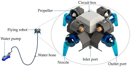 This study proposes a flying robot designed to operate in and around aquatic environments, allowing it to carry out various tasks such as firefighting, assisting marine towing operations, and more. The structural design of this system consists of three main components: a water pump, a water hose, and a flying robot. The overall structure of the system is depicted in Figure 2.
