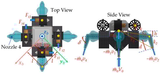 where vectors and describe the position of the center of the rotation of the ith nozzle and the part of the nozzle’s rotation with a length of d, respectively. In which, and denote the rotation matrices of the rotations and β about the corresponding –axis and –axis, respectively. Then, and are rewritten in terms of the forces at the nozzle outlets as follows: