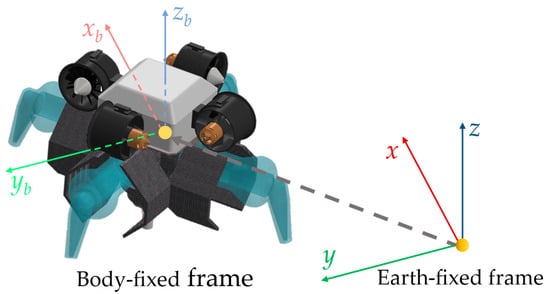 To derive the characteristics of the proposed robot in the air, two Cartesian coordinate systems, i.e., the body-fixed frame and Earth reference frame , are used, as depicted in Figure 4, in which the body-fixed frame has its origin placed at the mass center of the robot and its , , and axes point along forward, leftward, and upward directions, respectively. We assume that the mass center is also the centroid of the robot, for the sake of simplicity. The latter coordinates follow the east, north, and up directions, respectively. Moreover, the kinematic relationship between the two coordinates can be described via the following transformation matrices: