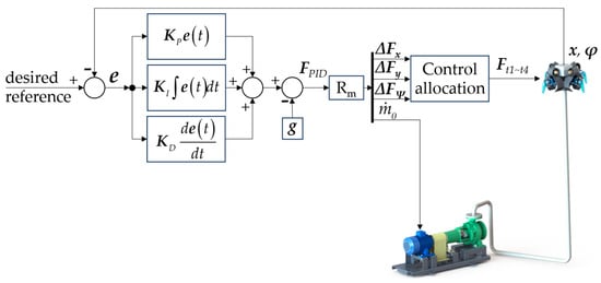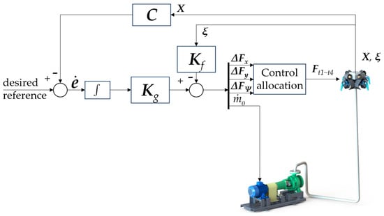In the above equation, is the vector of the actuating forces generated by the propeller’s thrust, and represents their resultant torques. and contain the forces and torque, respectively, generated by the water thrust. Additionally, is the gravitational acceleration vector observed from the reference frame, with the gravitational acceleration. is the vertical force created by the inlet water flow and pressure, where is its mass flow rate through the inlet port, , with the water density and A the inlet’s cross-sectional areas, is the axial velocity of the water flow, and P is the supplying pressure created by the pump. Finally, and are the remaining unmodeled terms, including wind gust, ground effect, and water hose effect.