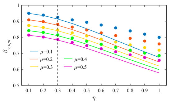 In order to validate the semi-analytical solution for , the numerical solution serves as the comparison benchmark. The variables used in the comparison are presented in Table 1. Three cases are given to consider the damping of the primary structure: small damping (1%, 2%, 5%), moderate damping (7%, 10%, 15%), and high damping (20%, 25%, 30%). Figure 3 compares the semi-analytical and numerical results for under negligible disturbance from . These dots and lines represent numerical solutions and semi-analytical solutions, respectively. The comparison result indicates that the proposed Equation (18) is accurate in calculating the optimal frequency ratio when the loss factor is less than 0.3. When the loss factor exceeds 0.3, the accuracy of Equation (18) decreases with the increase in the loss factor due to the third introduced simplification in Section 3.1.