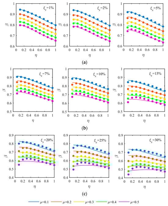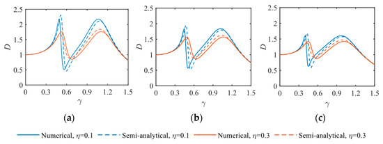 Figure 5 compares dynamic amplification factor curves derived from semi-analytical and numerical . Cases exhibiting significant deviations are selected: (a) , ; (b) , ; and (c) , —with loss factors of 0.1 and 0.3. The curves demonstrate close agreement, particularly in peak response characteristics, confirming the accuracy of Equation (21) for calculating the optimal frequency ratio of the VE TID.