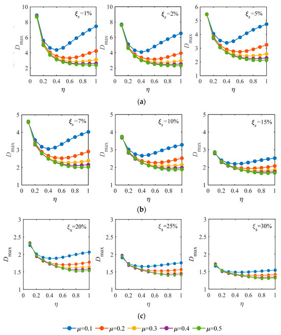 The maximum dynamic amplification factor with the loss factor. (a) The small damping cases; (b) The modest damping cases; (c) The high damping cases.