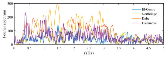 The natural frequencies of the 1st, 2nd, and 3rd modes are 1 Hz, 2.84 Hz, and 4.58 Hz. The damping matrix adopts the Rayleigh damping matrix by assuming that the damping ratios of the 1st and 3rd modes are 2%. Four ground motions from the benchmark control problem serve as input excitations: the El Centro, Northridge, Kobe, and Hachinohe earthquakes, abbreviated as E, N, K, and H, respectively [30], as shown in Figures 10, 12, 14, and 15. Figure 7 shows the Fourier spectra of the four earthquakes. Considering the VE TID is a tuning-sensitive damper, the frequency dependence of VE dampers is considered in the dynamic calculation using an extended state space method [27]. This method establishes a transfer function correlating the VE TID’s frequency-dependent force output with displacement, subsequently converted to a state-space model and integrated into the global structural equation.