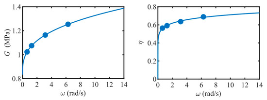 The shear storage modulus and loss factor varying with the excitation frequency.