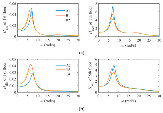 The transfer functions of the B1–B4 viscoelastically damped buildings. (a) ; (b) .