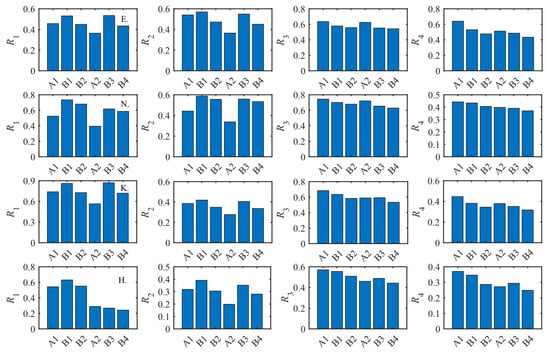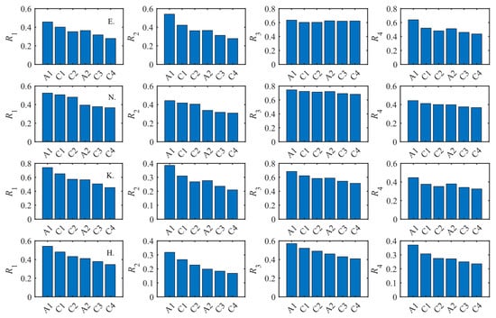Figure 12 shows the seismic response reductions of the C1–C4 viscoelastically damped buildings. The implemented VE TID effectively reduces interstory drifts under the El-Centro, Kobe, and Hachinohe seismic excitations. However, its effectiveness in mitigating interstory drifts during the Northridge earthquake remains limited. This discrepancy stems from the significantly lower dominant frequency of the Northridge ground motion compared to the fundamental natural frequency of the structure. In addition, the interstory drift reduction becomes more significant with the increase in the mass ratio or inertance, especially at . The added VE TID can effectively reduce floor accelerations under the four earthquakes, especially for the peak RMS floor acceleration. The change in the floor acceleration reduction with the mass ratio or inertance is not significant, which is consistent with the result in Figure 11. Therefore, it can be concluded that adding the VE TID with a modest mass ratio is efficient enough in enhancing the seismic performances of the viscoelastically damped building. Furthermore, analysis reveals that the C2 building exhibits seismic responses comparable to those of the A2 building. This indicates that the hybrid control strategy achieves control effectiveness similar to that obtained with the approach of installing additional VE dampers. Findings based on Figure 12 are also validated for structures incorporating viscous dampers.