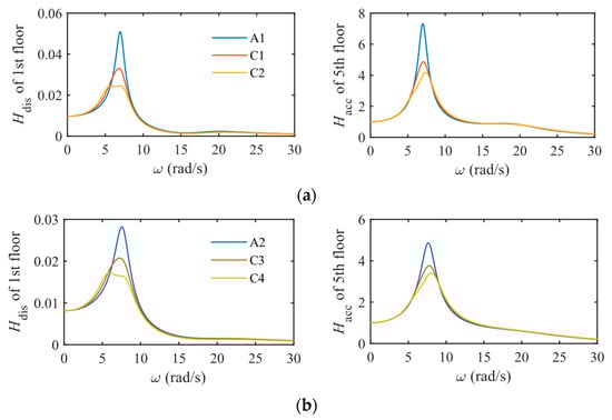 The transfer functions of the C1–C4 viscoelastically damped buildings. (a) ; (b) .