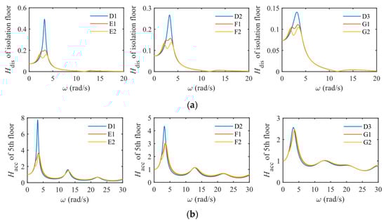 The transfer functions of the base-isolated buildings. (a) Transfer functions of the isolation floor; (b) Transfer functions of the 5th floor.